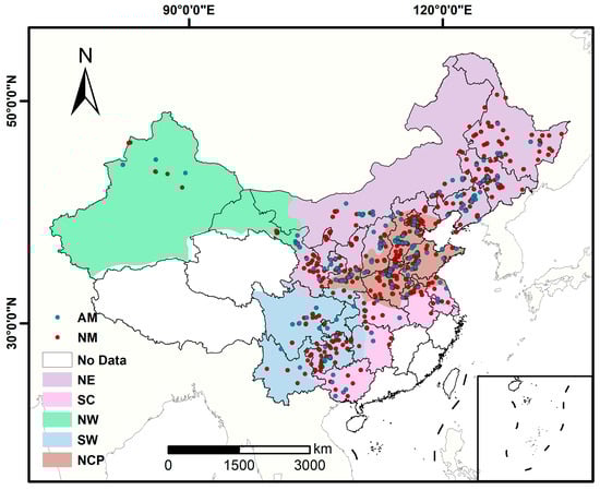 Distribution of experimental sites for different agronomic strategies across regions. Two agronomic strategies are shown: optimal planting density without agricultural measures (NM) and optimal planting density with agricultural measures (AM). The five major planting regions in China are displayed on the map in five distinct colors, including Northeast China (NE), North China Plain (NCP), Northwest China (NW), Southwest China (SW), and Southern China (SC). Blank areas on the map represent regions where data were not collected and are labeled as “No Data”.