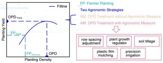 In addition, despite extensive research on the relationship between planting density and yield [17,43,48,49], key questions remain. Our study differentiates between OPD achieved through agronomic measures versus OPD without such interventions. This distinction is vital because prior research often conflated these scenarios, which may lead to less accurate calculations of yield gains attributed to increased planting density.