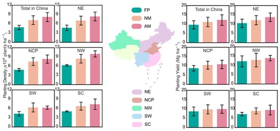 Planting density and yield responses under three agronomic strategies in China: farmer planting density (FP), optimal planting density without agricultural measures (NM), and optimal planting density with agricultural measures (AM). Data are presented for the five major planting regions in China, including Northeast China (NE), North China Plain (NCP), Northwest China (NW), Southwest China (SW), and Southern China (SC).