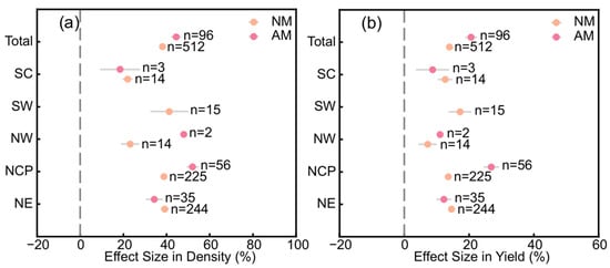 Overall, the OPD and OPD yields effects of AM were significantly higher than those of NM by 6.32% and 6.67%, respectively (Figure 4). The impact of AM and NM on density was positive across all regions. The effect size of NM on OPD ranged from 22.00% to 41.27% in different regions, with an overall effect of 38.14%, while AM demonstrated a positive effect size of 18.47% to 52.05% in OPD, totaling an overall effect size of 44.46% (Figure 4a). A similar trend was observed in yields response (Figure 4b), where AM exhibited a positive effect size of 8.74% to 26.84% in yields, totaling an overall effect size of 20.62%. In contrast, NM showed lower effect sizes, ranging from 7.24% to 17.20% across different regions, with a total effect size of 13.95%. Notably, AM displayed higher yield improvements in regions such as the North China Plain and Northwest China compared to NM. However, the effect sizes of AM on OPD yields were lower in Southern China, and the effect sizes of NM on OPD yields were lower in Northwest China.