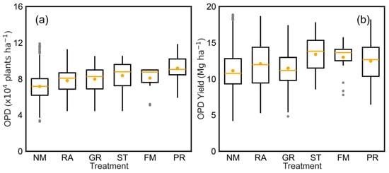 where and represent: (1) The OPD in agronomic strategies and density in farmer density, respectively; (2) The OPD yield in agronomic strategies and yield in farmer density, respectively. represents the number of treatments.