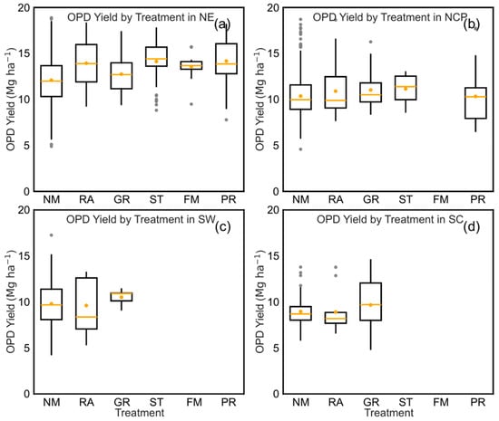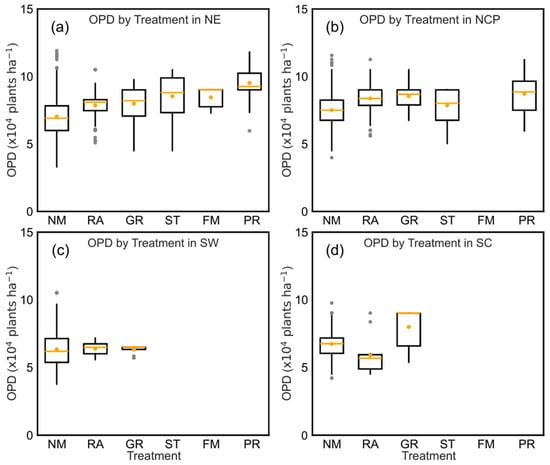 Effect of agronomic measures on optimal planting density (OPD) of maize in (a) Northeast China (NE), (b) North China Plain (NCP), (c) Southwest China (SW), and (d) Southern China (SC). Agronomic measures include row spacing adjustment (RA), use of plant growth regulators (GR), soil tillage (ST), plastic film mulching (FM), and precision irrigation (PR). Data are included only for treatments with a sample size (n > 5) and supported by at least three published studies. Note: Data for Northwest China (NW) are not available. The yellow dots in the box plot represent the mean, the yellow lines represent the median, and the grey dots are outlier.