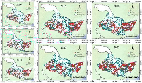 The overall area of HLJ is large, and for this study, it was divided according to 12 prefecture-level cities. Each prefecture-level city was further divided into 16 equal-sized grids, and rice and non-rice sample points were extracted from each grid to finally summarize all the sample points. This method ensured the reliability of the generated samples while controlling the spatial autocorrelation to some extent. The spatial distribution of the extracted sample points is shown in Figure 2 and was visually evaluated using Landsat images, Sentinel-2 images, and Google images. Finally, the distributional accuracy was assessed by calculating the overall accuracy (OA) and Kappa coefficient.