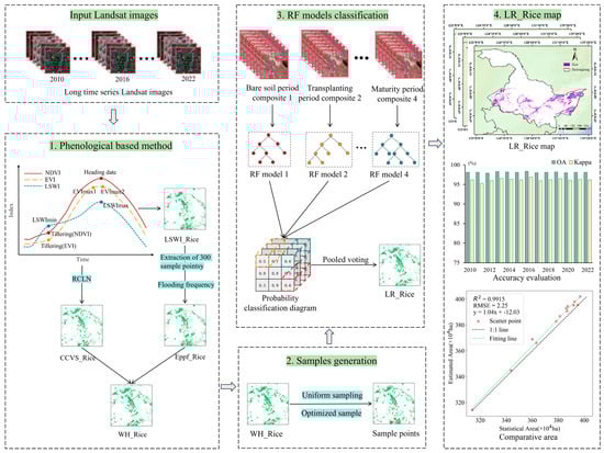 In summary, this study proposes a rice mapping method (LR) on GEE, which uses Landsat images and integrates automatic training sample generation and an RF algorithm with the assistance of phenological methods. Initially, a rice distribution map was generated based on the LSWI method, and 300 sample points were selected for use with the Eppf-CM method to identify rice image elements by comparing high-resolution images. Subsequently, the inundation frequency (F) and the improved statistical characteristics of sample points indicating the ratio of change in amplitude of LSWI to NDVI (RCLN) were introduced, combined with consideration of vegetation phenology and surface water variation (the CCVS method) to extract rice data. Fusing Eppf-CM with the CCVS method, the potential rice distribution map was generated. The stratified sampling automatically generated rice/non-rice training samples, and the samples were optimized by extracting neighborhood information via an alternating iterative method. The purified sample data were used to generate synthetic data in stages according to the four phenological periods, and the machine learning model was trained independently for each phenological period to obtain the corresponding probabilistic classification maps. An ensemble voting strategy was used to draw the final rice distribution map. This method overcomes the limitations of time span associated with high-resolution images, expands the available data window, and effectively alleviates the problems of missing data within long-time-series large-scale rice mapping samples, to finally realize automated rice mapping.