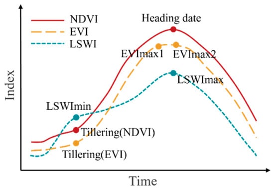 where and represent LSWI and NDVI values at the tasseling stage, and and represent LSWI and NDVI values at the transplanting stage, respectively.
