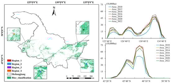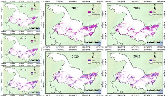 - Existing products offering rice mapping of northeast China use data for discrete years and most of them have low resolution. In this study, rice distribution maps with 30 m resolution were generated only for 2010–2022 in HLJ. It is important to extend the analysis timeframe into earlier eras to reveal changes in planting density over longer time scales;
