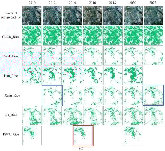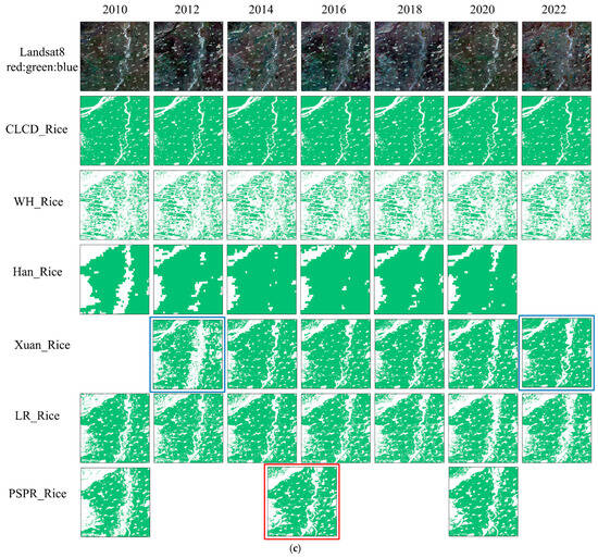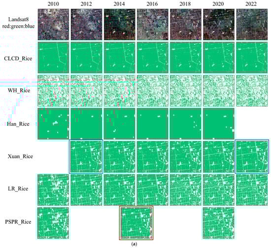 Figure 7 shows a comparison of LR_Rice with five sets of rice mapping results from four selected sites for 2010–2022 (two-year interval). Since the rice distribution maps for Xuan_Rice have a time frame of 2013–2021 and PSPR _Rice has a time frame of 1990–2020 (five-year interval), and considering that the differences in rice distribution between subsequent years are small, Xuan_Rice 2013 and 2021 were used to fill in 2012 and 2022, respectively; Xuan_Rice’s contributions are labeled with blue boxes, and data from 2015 PSPR _Rice are labeled using red boxes in Figure 7.