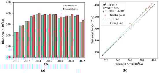 The obtained agricultural census data were compared with LR to generate maps of the rice area in Heilongjiang Province from 2010 to 2022, and the results are shown in Figure 8. The coefficient of determination R2 between the rice area obtained based on LR_Rice and the statistical data was 0.9915, and the RMSE was 22.5 kha, and the two showed an obvious linear relationship, confirming that the agricultural statistics were consistent with and the rice area maps obtained with LR_Rice, reflecting the good classification performance of the LR algorithm.