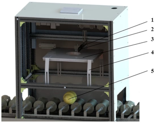 Structural diagram of image acquisition box. 1. Camera mounting bracket. 2. Daheng industrial camera. 3. Annular light source. 4. Light source support frame. 5. Potatoes.