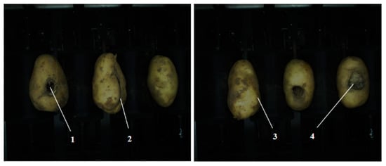 To heighten the stability of the dataset, the potato images collected by industrial cameras were manually screened to remove duplicates and those of poor pixel quality, resulting in a set of qualified sample images. From the collected potato images, we saved 900 images in JPG format with 2448 × 2048 pixels, of which the number of samples with dry rot, insect eyes, or damage and normal potato samples were 224, 223, 226, and 227, respectively. Some sample images are shown in Figure 2.