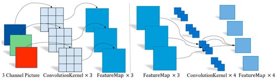 Depthwise separable convolution can reduce parameter count, making it an essential option for deployment on mobile devices. The conventional convolution operation is simplified into two sequential stages through this technique: depthwise convolution followed by pointwise convolution. Depthwise convolution performs convolution separately for each input channel without involving cross-channel computations, ensuring that each processed input channel produces one output channel. Pointwise convolution then uses a 1×1 convolution kernel to process the output of the depthwise convolution, mixing the various output channels to generate the final output channel [25].
