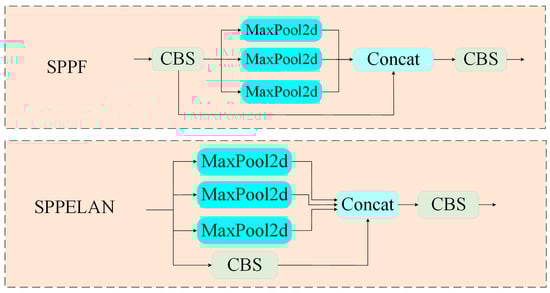The introduction of Spatial Pyramid Pooling Fast (SPPF) and SPP Enhanced with ELAN (SPPELAN) has significantly enhanced the properties of YOLOv5s [26]. SPPF is an optimized spatial pyramid pooling technique that inherits the traditional SPP’s capability to heighten the algorithm’s capability to detect surface defects on potatoes through multi-scale pooling. Unlike SPP, which applies pooling layers of varying scales (e.g., 5 × 5, 9 × 9, 13 × 13) for multi-scale feature extraction, SPPF streamlines this process by utilizing three consecutive 5 × 5 small-scale pooling layers. This refinement reduces the number of multi-scale pooling operations, and reduces computational complexity through feature map compression and rapid pooling strategies, alleviating the potential impact on real-time performance caused by the substantial computation demands of traditional SPP.