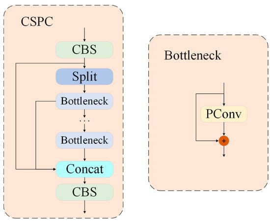 Then, we introduce a novel structure called the CSPC module, which overcomes the previous C3 module’s computational redundancy limitations. This design achieves a lightweight architecture, and greatly improves the accuracy of potato surface defect detection. The advancement of the field in machine vision is demonstrated by expanding indirectly the depth of the neural network and the count of feature layers, and the optimization framework enables continuous performance enhancements. However, this also leads to trivial information redundancy and increased computational costs. This paper presents an improved method that utilizes Partial Convolution (PConv) to introduce the new CSPC structure, replacing the C3 structure in the YOLOv5s network, as illustrated in Figure 5. As a core component of the CSPC network module [29], it enhances the efficiency of the potato surface defect algorithm by reducing computational redundancy through improved traditional convolution operations.