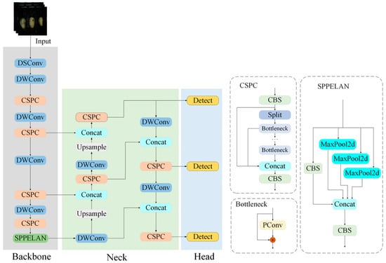 To preferably increase the capacity of the algorithm to extract small objects like potato surface defects, the SPPF in the YOLOv5s network was replaced with the SPPELAN module, which combines SPP and ELAN. This combination allows for multi-scale pooling and feature extraction, reducing model complexity while greatly heightening detection capability. It especially enhances the capacity of the algorithm to extract small objects like potato surface defects [37,38].