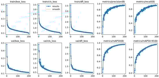 In this experiment, the Adam optimizer was used with an initial learning rate of 0.01, a decay factor of 0.05, and a momentum of 0.937. The input image size was set to 640 × 640, and a total of 200 training iterations, with a batch size of 16, were utilized. The trend of training results is shown in Figure 9.