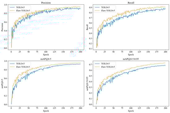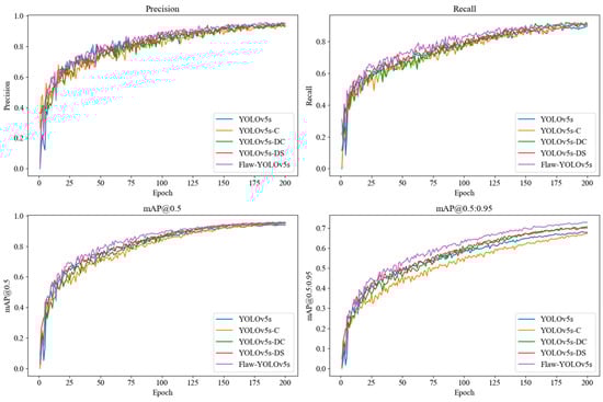 To assess the comparative effects of the ablation experiments on the improved model, refer to Figure 12. The training trends and outcomes for each model indicate rapid growth during the initial 50 rounds, followed by a plateau and gradual stabilization after 200 training iterations, demonstrating excellent convergence without any signs of overfitting. Moreover, compared with other models, the enhanced Flaw-YOLOv5s model achieves better detection performance.