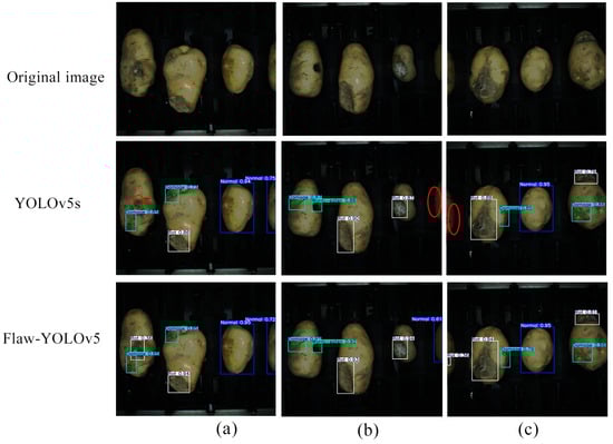 Figure 11 presents a visual contrast of detection metrics between the baseline and improved models, with different sample comparisons, highlighting enhanced algorithm adaptability. The results show that the Flaw-YOLOv5s algorithm not only detects the features of potato surface defects but also exhibits a stronger ability to accurately identify surface defects in edge regions, mainly for features that are difficult to distinguish. For instance, in Figure 11a, YOLOv5s displays apparent missed tests, whereas the Flaw-YOLOv5s model successfully identifies the surface defects associated with rot. Additionally, in Figure 11b,c, the potato features in the edge regions are not exactly observed by the YOLOv5s model. In comparison, the Flaw-YOLOv5s model exactly detects subtle defect features and accurately classifies different kinds of potato defects, achieving superior detection accuracy.