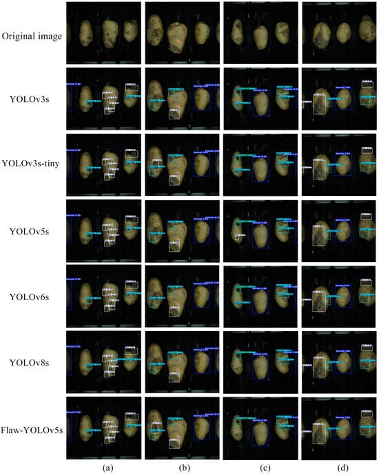 We conducted a more transparent performance comparison between the Flaw-YOLOv5s model and existing potato surface defect detection models by evaluating a randomly selected set of potato images. The comparative results are presented in Figure 13. As observed in Figure 13, the distinct detection outcomes of various models are evident. For instance, in subfigures a and c of Figure 13, the Flaw-YOLOv5s model successfully and accurately identifies surface defect features. In contrast, other detection models misclassify potato skin texture as surface defects, leading to occasional errors due to false positives. In comparison, subfigures b and d of Figure 13 highlight that the YOLOv3, YOLOv5s, YOLOv6s, and YOLOv8s models also exhibit missed detection issues, where subtle potato defect features are not accurately captured. Overall, while conventional potato defects are generally detected across all models, the ability of other models to identify less conspicuous defect features remains limited, potentially impacting their application in practical potato sorting tasks. The Flaw-YOLOv5s model, enhanced by integrating a PConv template, significantly improves its capability in extracting fine defect features, effectively addressing these limitations and fulfilling the requirements of current potato surface defect detection applications. In summary, the enhanced Flaw-YOLOv5s balances lightweight design and exceptional detection precision, making it particularly applicable for real-world applications.