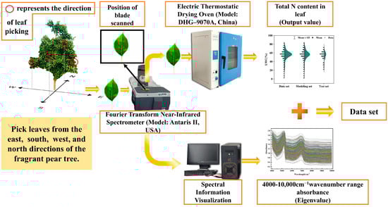 From 15 July to 30 August, leaves were collected every 15 days from well-grown trunk-shaped fragrant pear trees, resulting in four collections. As shown in Figure 1, Leaves were sampled from the east, south, west, and north directions at mid-height on the tree(The red circle in Figure 1). Twenty leaves per tree were collected, stored in labeled Ziplock bags, and transported to the laboratory. Dust was removed with a damp cloth, and the samples were temporarily stored at −4 °C. Prior to spectral measurement, the samples were conditioned in the measuring chamber for 12 h at 20 °C and 60% relative humidity. The Antaris II FT-NIR spectrometer was preheated for 30 min to ensure stability. Diffuse reflection calibration was performed before fixing the blade for measurement. Six regions were selected on the upper, middle, and lower portions of both sides of the blade, bounded by the veins. Each region was scanned three times within the range of 10,000–4000 cm−1, with a resolution of 8 cm−1, gain of 2×, and 32 scans. Eighteen spectral curves were obtained per sample, and their average was used as the final absorbance value. Finally, these data were further analyzed and processed to establish a predictive model [23].