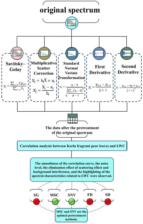 The process used when utilizing spectral technology to analyze LWC and other relevant features of Korla Xiang pear leaves is illustrated in Figure 2. The original spectral data often exhibit issues such as baseline deviation, noise interference, and significant differences in absorbance, which severely affect the accuracy of the subsequent feature extraction and model construction. Spectral pretreatment methods can effectively address these problems. Preprocessed data were used to generate correlation images, evaluate curve smoothness, noise levels, and scattering effects, eliminate background interference, and highlight spectral features related to LWC. This process facilitates the screening of the optimal preprocessing method. Below, several commonly used spectral pretreatment methods are introduced in detail.