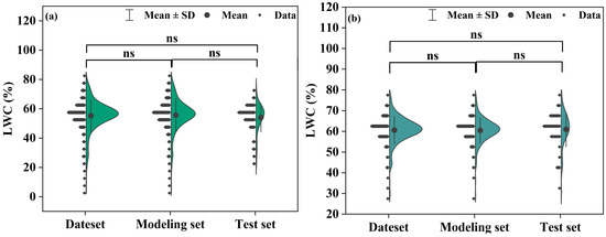 From Figure 3, the mean and SD values for each growth stage can be derived. In the S1 stage, the LWC in the modeling dataset ranged from 4.88% to 83.45%, with an SD of 11.33%. In the testing dataset, the LWC ranged from 22.03% to 74.29%, with an SD of 9.70% (Figure 3a). For the S2 stage, the LWC in the modeling dataset ranged from 28.77% to 76.52%, with an SD of 6.09%, while in the testing dataset, the LWC ranged from 30.86% to 77.55%, with an SD of 8.32% (Figure 3b).