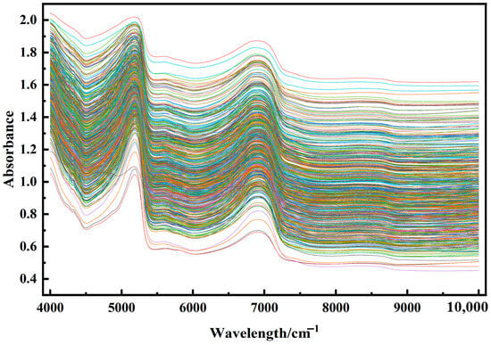 As illustrated in Figure 4, the absorbance values exhibit a complex trend across the entire wavelength range (4000 cm−1 to 10,000 cm−1). The absorbance values cover a wide dynamic range from 0 to 2.0, indicating significant variations in the light absorption capacity of the material or system under investigation within this spectral region. In the 4000 cm−1 to 5000 cm−1 range, the absorbance values gradually increase from a relatively low baseline. Notably, some curves exhibit a steep rise in this interval, suggesting the presence of specific absorption mechanisms or material components that interact strongly with light in this wavelength range.