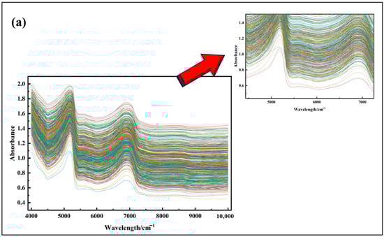 Figure 5 illustrates the original spectral curves and their mathematical transformations for Korla fragrant pear leaf samples. As shown in Figure 5a, the original absorbance (A) varies significantly among samples, with noticeable baseline shifts and tilts. These variations can be attributed to differences in light absorption characteristics and optical path lengths within the leaves. After applying SG convolution smoothing Figure 5b, the spectral curves become more centered, though the overall trend remains largely unchanged. Following MSC and SNV Figure 5c,d treatments, the differences in absorbance are significantly reduced, resulting in more concentrated and consistent spectral curves.