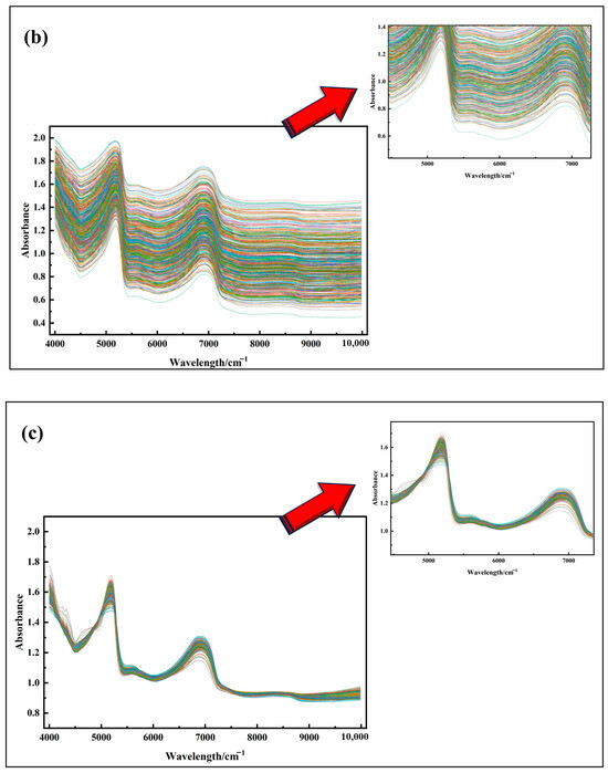 The spectral data obtained within the 4000–10,000 cm−1 range exhibit complex trends, with significant fluctuations in absorbance values. While these data contain rich spectral feature information, they are also plagued by interference factors such as baseline shifts and noise, which impede the precise extraction of LWC-related features [14,15,16]. Despite these challenges, existing research predominantly relies on a single preprocessing method, lacking a thorough exploration and optimization of the combined effects of multiple preprocessing techniques.
