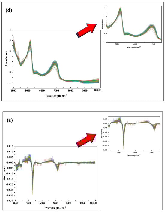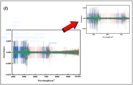 The FD-transformed spectrum (Figure 6e) and SD-transformed spectrum (Figure 6f) excel at emphasizing subtle changes, reducing background interference, and improving feature extraction accuracy. However, due to weak signal strength in certain spectral regions, noise is amplified during the derivative conversion process, resulting in burrs. To address this, noise reduction measures should be incorporated to ensure accurate and reliable results.