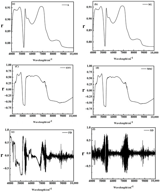 Correlation between LWC of Korla fragrant pear and different transformation spectra. (a) Original spectrum (b) SG convolution smoothing spectra (c) MSC treatment spectra (d) SNV treatment spectrum (e) FD transform spectrum (f) SD transform spectra.