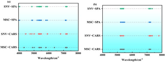During the S1 stage (Figure 7a), the SNV-SPA feature bands, represented by green dots, are primarily concentrated around 5000 cm−1, 6000 cm−1, and 7000 cm−1, indicating specific correlations with LWC. The MSC-SPA feature bands, depicted by blue dots, are distributed around 5500 cm−1 and 7500 cm−1, reflecting the unique spectral characteristics of the Korla fragrant pear LWC. The SNV-CARS feature bands, shown as red dots, cover a broader range around 4500 cm−1, 5500 cm−1, and 8000 cm−1, suggesting a wider association with LWC. The MSC-CARS feature bands, marked by black dots, are concentrated near 6000 cm−1 and 7000 cm−1, highlighting their importance within specific wavelength ranges.