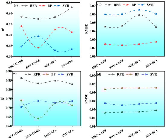 Figure 8 illustrates the performance indicators of the LWC predictive model for Korla fragrant pear, comprising four subfigures labeled as Figure 8a–d. Each subfigure features three curves representing distinct predictive models: RFR (denoted by a black dotted line), BP (indicated by a red dotted line), and SVR (represented by a blue dotted line). The x-axis of each subfigure corresponds to various feature selection methods, namely, MSC-CARS, SNV-CARS, MSC-SPA, and SNV-SPA. The y-axis in Figure 8a,c displays the coefficient of determination (R2), whereas Figure 8b,d depict the RMSE.