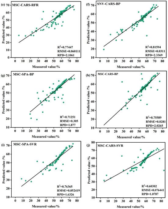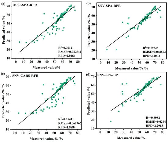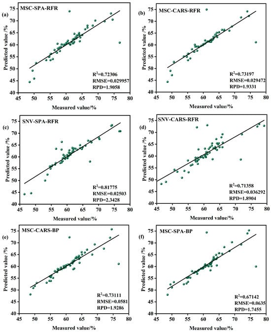 Among the subplots, the models based on the RFR algorithm demonstrate strong performance in most cases. For instance, the SNV-CARS-BP model achieves an R2 value of 0.81594, indicating an excellent fit, with an RMSE of 0.0311%, reflecting minimal prediction error, and an RPD of 2.3369, highlighting robust predictive capability and stability. Similarly, the SNV-SPA-BP model performs well, with an R2 of 0.8082, an RMSE of 0.0264%, and an RPD of 2.2913. In contrast, certain RFR-based models, such as the SNV-SPA-RFR model, exhibit slightly lower performance, with an R2 of 0.79328, an RMSE of 0.048503%, and an RPD of 2.2002. Another RFR model shows an R2 of 0.77447, an RMSE of 0.060111%, and an RPD of 2.1061, indicating room for improvement.