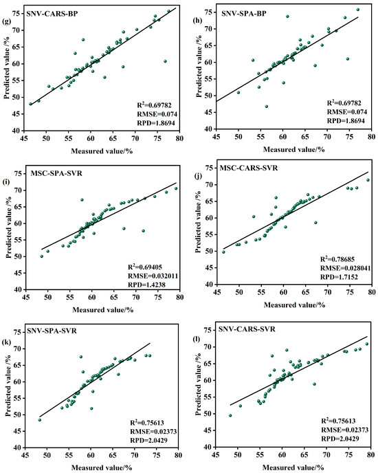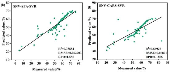 Model validation in the S1 period. (a) MSC-SPA-RFR model validation (b) SNV-SPA-RFR model validation (c) SNV-CARS-RFR model validation (d) SNV-SPA-BP model validation (e) MSC-CARS-RFR model validation (f) SNV-CARS-BP model validation (g) MSC-SPA-BP model validation (h) MSC-CARS-BP model validation (i) MSC-SPA-SVR model validation (j) MSC-CARS-SVR model validation (k) SNV-SPA-SVR model validation (l) SNV-CARS-SVR model validation.