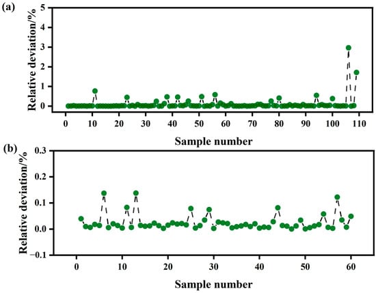 In Figure 8b, the RFR model’s RMSE values are consistently low and stable, all below 0.7%, indicating minimal deviation from actual values and high predictive accuracy. The BP model’s RMSE values remain around 0.6% across different methods, suggesting consistent performance in predictive error despite fluctuations in R2 values. The SVR model’s RMSE values vary more significantly, generally higher than those of the RFR model, with some values nearing 0.8% under certain methods, indicating larger prediction errors and a need for improved accuracy.