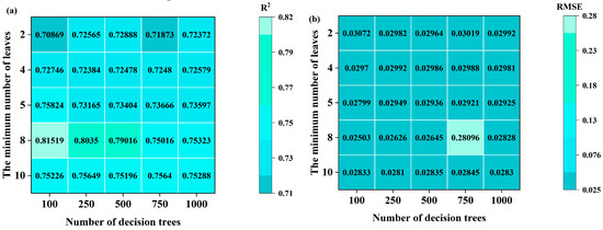 In the model development process, the performance of machine learning models is significantly influenced by the selection of hyperparameters. Optimizing these hyperparameters directly impacts the model’s generalization ability and prediction accuracy [46]. To ensure optimal model performance, grid search and cross-validation were employed in this study to fine-tune the hyperparameters of RFR, SVR, and BP. The results are illustrated in Figure 12a,b.