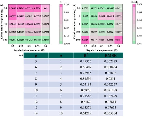 For the BP model, the SNV-CARS-BP model of the S1 stage of Korla fragrant pear was used as an example, and grid search was employed to determine the optimal constant α. As shown in Figure 12e, variations in the number of q and the constant α result in significant fluctuations in the model’s R2 and RMSE values. Notably, when q = 8 and α = 4, the model achieves the highest R2 value of 0.81594 and the lowest RMSE value of 0.0311%, indicating the best model fit. Therefore, the optimal parameters for this model are q = 8 and α = 4.
