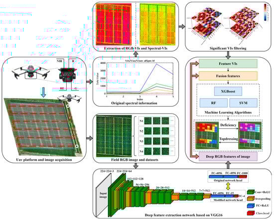 41]. Therefore, this study proposes a novel framework for classifying nutrient deficiencies and formulating fertilization management strategies in field-grown rice, aiming to accurately reflect the actual nutrient deficiency conditions during rice growth. The framework integrated visible light VIs, multispectral VIs, and image features extracted through deep neural networks, leveraging the complementary strengths of these feature types to achieve accurate and robust nutrient deficiency classification. By utilizing UAV platforms for high-throughput and regionalized field detection, the framework generates real-time fertilization prescription maps based on actual nutrient deficiency conditions, enabling intelligent and precise management of rice growth. This approach not only enhanced the efficiency and accuracy of nutrient diagnosis but also aligned more closely with practical production needs, offering a scalable solution for optimizing rice cultivation and ensuring food security.