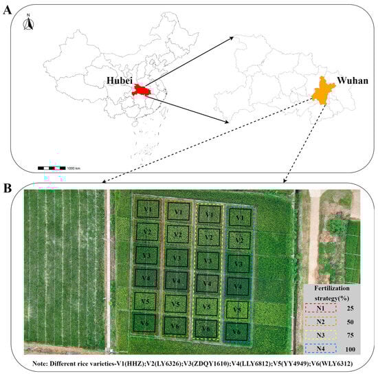 Figure 2A, this study was conducted in 2024 at the rice cultivation base of Huazhong Agricultural University in Wuhan, Hubei Province, China (30.474852° N, 114.356769° E). The study focused on a controlled nutrient deficiency experiment for high-quality ratoon rice. The study area is characterized by a subtropical monsoon climate, with favorable environmental conditions, distinct seasons, abundant sunlight, and ample rainfall. The average annual rainfall is 1269 mm, and the average annual temperature ranges between 15.8 °C and 17.5 °C. In this study, the main growing season of the ratoon rice spanned from 30 April 2024 (transplanting date) to 3 August 2024 (main season harvest date), while the ratoon season continued until 10 October 2024 (ratoon season harvest date). Field management practices followed local standards, including sufficient irrigation, necessary herbicide and pesticide applications, and other standard agronomic practices.