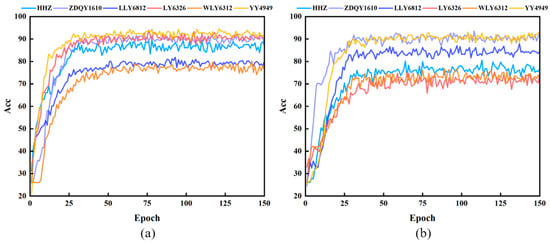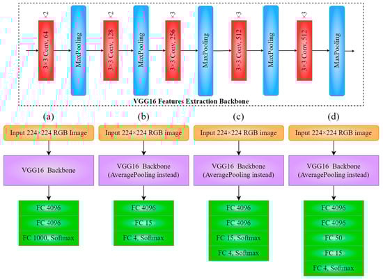 Figure 4b,c showed no significant difference in classification accuracy, indicating that the parameter size of the FC-4096 structure was fully sufficient for the four-class classification task and did not require additional stacking. In conclusion, considering both the effectiveness of the feature extraction model and the parameter size, this study selected the network structure shown in