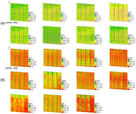 The selected VI feature combinations were used in the subsequent construction of the classification model. Since the S2 period fell within the fertilization window for the ratoon season, its classification results were used to guide specific topdressing measures. The intuitive color distributions of the field VI features during the S2 period are shown in