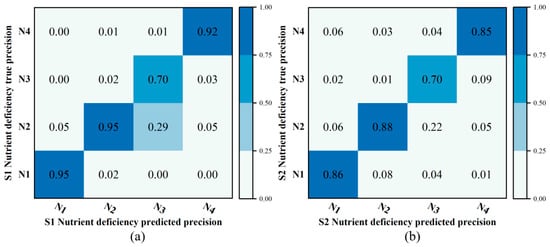 To enhance the effectiveness of the proposed classification model, the study on nutrient deficiency classification based on the six feature vectors was conducted during both the S1 and S2 periods. The classification model constructed during the S2 period was used to guide the topdressing strategies for the ratoon season.