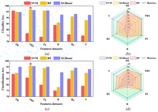 Figure 9b,d), where points representing fused feature accuracy clustered closer to the best classification accuracy (blue border) compared to non-fused features.