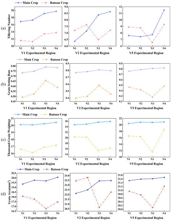 After applying the topdressing strategy described above to the rice varieties in the N1, N2, and N4 treatment zones, field sampling was conducted before the ratoon season harvest to measure the values of four traits: tiller number, seed setting rate, thousand-grain weight, and grain area. These values were then compared with the trait values measured during the main season harvest. The specific changes in trait values for each variety across the two seasons are shown in
