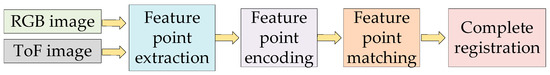 Heterogeneous image registration involves aligning images captured with different imaging devices or at different time points to simultaneously utilize information from these multiple images. Due to the spatial resolution limitations of single-sensor band imaging, the target interpretation capacity of single-sensor images is limited, making it difficult for them to accurately and comprehensively represent the target object. Researching heterogeneous image registration technology creates conditions to solve these problems. Heterogeneous image registration utilizing Time-of-Flight (ToF) and color cameras often involves significant geometric differences. Different sensors have different imaging principles because of the wide variety of methods and means for collecting image data. Similar objects usually show significantly different visual characteristics in terms of their grayscale and texture [1], and there may be a high degree of complementarity and redundancy between different images. Therefore, heterogeneous image registration and fusion techniques can be used to obtain richer and clearer target information from the same scene. The premise of this technology is that accurate registration of heterogeneous images can effectively utilize the advantages of various sensors to integrate and provide multi-dimensional imaging results for the same scene, improving target information perception and the representational capacity of fused images [2].