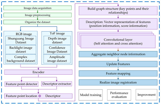 We made the above improvements to the model and designed an experimental plan to verify its performance. The experimental process includes image dataset acquisition, model improvement, model training, and performance evaluation. Figure 6 shows the architecture of an image registration system based on image data processing and feature extraction. The entire system starts with image data acquisition, goes through multiple processing steps, and finally achieves image registration, as well as model training, performance evaluation, and improvement. This study’s framework is shown in Figure 7.
