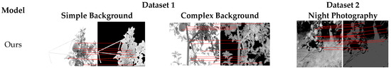 This study conducts comparative experiments with seven models, including SIFT, SURF, ORB, LoFTR [28], MatchFormer, SuperGlue, and LightGlue. The visualization analysis of heterogeneous image registration results is a comprehensive process that requires a combination of multiple methods and tools for comprehensive evaluation. Through these methods, the performance of registration algorithms can be better understood, providing valuable information for further research and applications. The experimental results of our model on Dataset 1 and Dataset 2 are shown in Figure 8. The average values of each indicator tested on Dataset 1 for each registration algorithm are shown in Table 3.