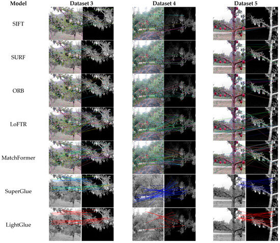 Figure 9 shows a comparative experiment of eight image registration models using Dataset 3~5. From the results, it indicates that traditional registration algorithms, such as SIFT, SURF, ORB, etc., have the problem of low feature point detection accuracy and even more feature point matching errors when processing heterogeneous image registration. However, Transformer-based models such as LoFTR and MatchFormer enhance the performance of the model in low-texture scenes, using local feature matching methods to more effectively solve the matching problem in scenes with significant perspective changes. They can detect more feature points, but there is a problem of low registration accuracy. LightGlue is a matching algorithm based on the SuperGlue model, which generates a matching cost matrix through graph neural networks and solves for the optimal matching matrix to obtain the globally optimal matching result. These models have higher accuracy compared to the previous models. This study improves on SuperGlue by using residual structures in the feature point encoding module and optimizing the Sinkhorn algorithm in the feature matching module. The AutoDiff technique is used to automatically calculate gradients and further obtain good results of accuracy and efficiency of differentiation, allowing the model to detect more feature points. Therefore, higher matching accuracy can be achieved without affecting registration efficiency compared to the seven previous models.