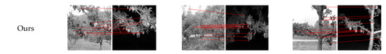 - The Sinkhorn AutoDiff algorithm is used to perform model pruning and network parameter compression on the network module of feature point matching to reduce computational complexity. From the ablation experiment results of Table 5 and Table 6, optimizing the matching process through global contextual information can effectively improve the accuracy and robustness of heterogeneous image matching and perform well in handling complex scenes. After adding a residual mechanism to the feature point encoding module, a larger number of key points were ultimately extracted. After adopting automatic differentiation processing technology for the Sinkhorn algorithm, the performance was better in calculating the optimal transmission problem. It can maintain high matching accuracy, even in the presence of occlusion and repeated textures.