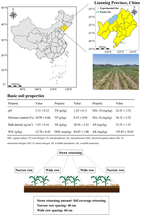 The field had been under continuous maize cultivation for many years before the experiment. After the harvest of the previous season’s maize, straw was spread evenly over the surface. The following year, no-till planters were used for sowing, and wide, narrow rows were planted alternately (Figure 1). Before starting the experiment in 2023, five soil cores (0–20 cm depth) were extracted from each experimental field with a 5.0 cm diameter soil drill using the five-point method. The soil samples were thoroughly homogenized, passed through a 2 mm sieve, and used for determining soil physicochemical properties. Details of the experimental site are illustrated in Figure 1.
